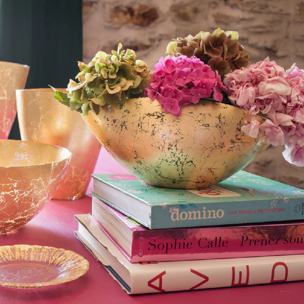 Eye-catching and unique, the Moon Glass Envelope Bowl is created with a traditional Italian technique: artisans handpress metallic gold into each piece, and then they polish the gold for a textured effect with beautiful patina. With its architectural shape and brilliant color, this bowl makes a striking statement.
