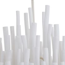 This rustically refined chandelier instantly transforms a space. The multi-tiered form features wooden dowels, finished in white, on curved and pliable iron arms.  The wooden rods will arrive with a series of inherent fissures and cracks that will widen and multiply over time. This is considered a natural occurrence and is both beautiful and intentional. During installation, please ensure the bulbs are not in contact with the wooden components by gently adjusting the arms to create a one-inch minimum distance between the dowels and bulbs. Each piece will vary in size, shape, and finish. Additional chain available (CHN-959).