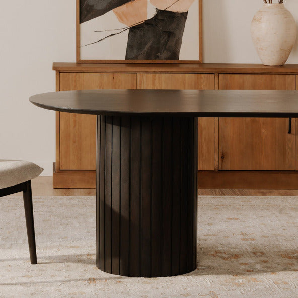 Bring architectural artistry and natural warmth to your dining space with the Povera Dining Table. Designed around sculptural simplicity, it features two ribbed pillar-style bases that anchor an expansive rectangular tabletop. Crafted from solid Acacia wood, the table’s rich finish and visible grain pattern highlight its organic beauty. Perfect for large gatherings or modern interiors, this piece blends contemporary structure with timeless craftsmanship.
