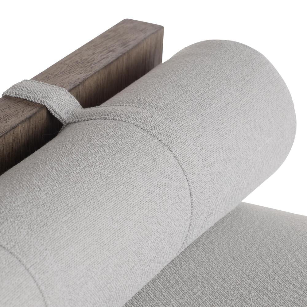 Part of our Dominic Collection, the Daybed is fashioned from grade-A solid teak veneer stained in a willow finish and engineered marine-grade hardwoods.  Punctured split sides and fine joinery details give this design the illusion of puzzle pieces joining together. Accented with aged bronze stainless-steel braces that dramatically secure two bolster pillows, it is comfortably upholstered in porpoise outdoor performance bouclé. Finish will vary.