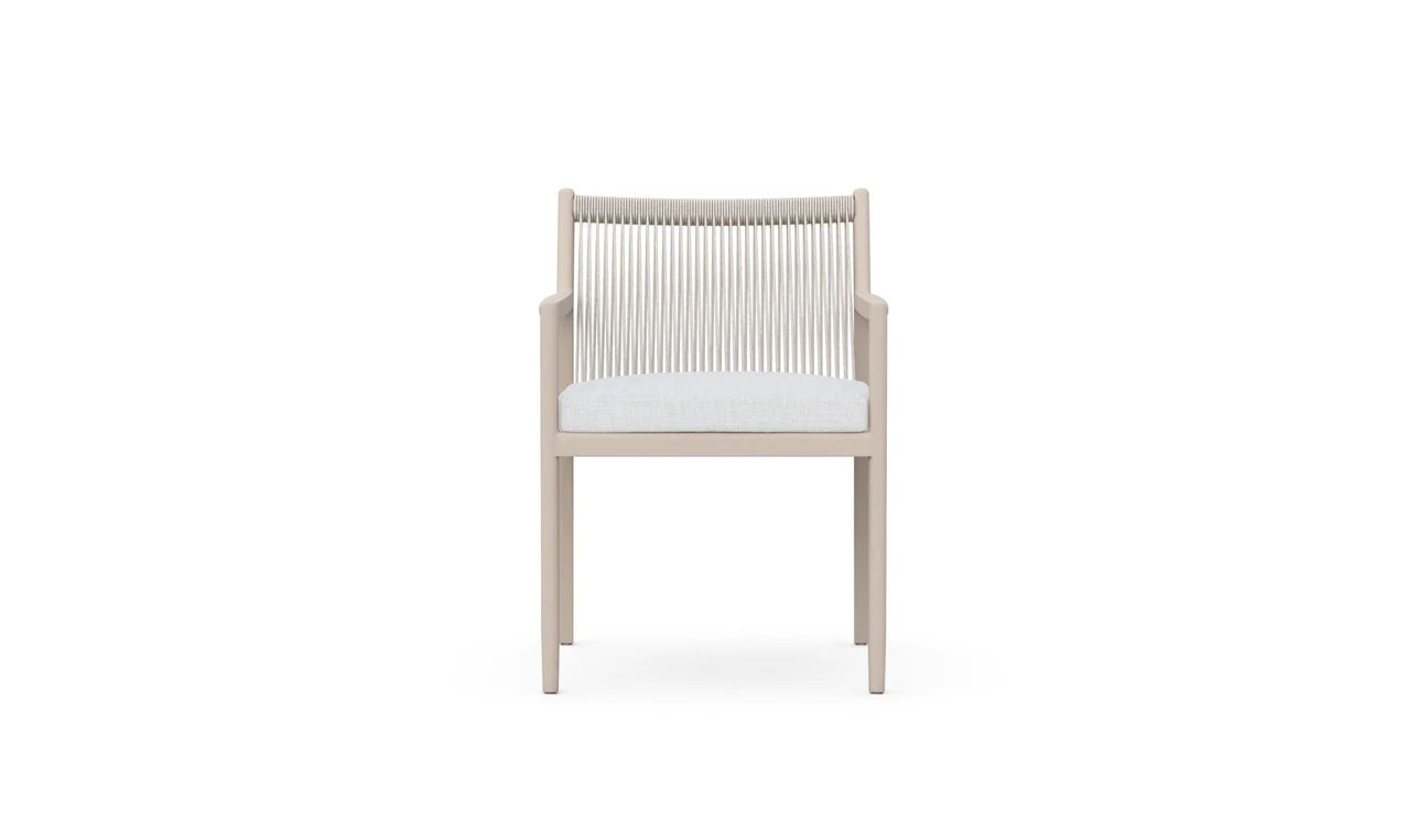 The Madeira Dining Chair from Azzurro Living excites audiences with linear, breezy weaves of all-weather textelene rope, rigorously formulated to resist harsh weather. Its captivating design offers reliable comfort through a parallel system of support, while high-density cushions in soft performance fabric ensure lasting comfort and durability, making it an alluring and sophisticated choice for outdoor relaxation. Sit back and rest easy in the sophisticated, mid-century modern Madeira Dining Chair.