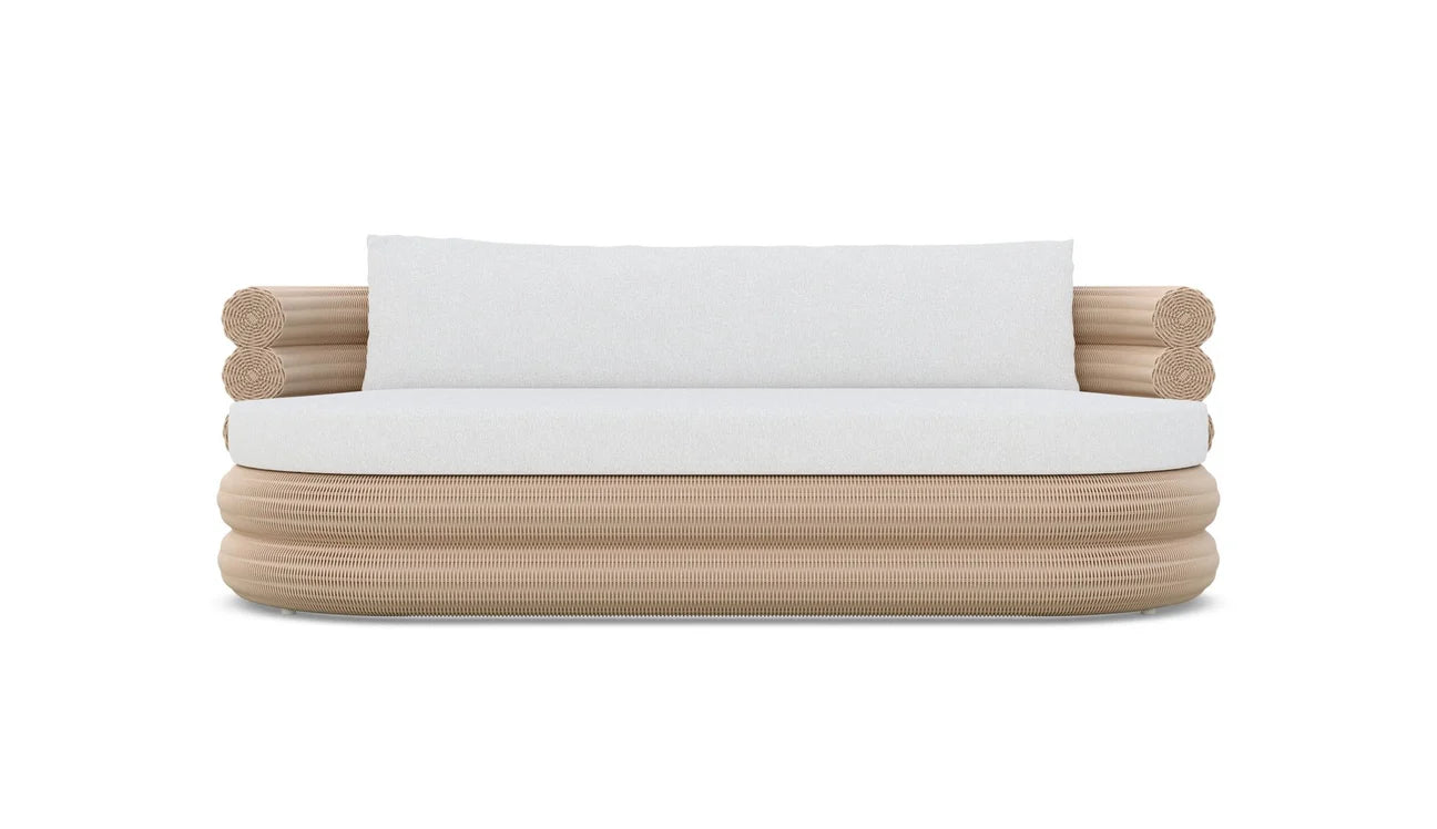 Experience luxury and comfort with the Texoma outdoor 3-seat sofa by Azzurro Living. This high-end sofa is made with all-weather wicker in a sophisticated almond color and features a luxurious chenille outdoor performance fabric for added comfort and durability. The intricate textures and clean lines of the sofa create a classically glamorous and modern silhouette, balancing old and new in a swoon-worthy design.