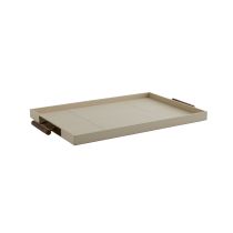Elegant geometry and refined materials bring this contemporary tray to life. Wrapped entirely in supple ivory leather with tailored stitching is beautifully crafted, adding to its quality and charm. For ease of use, brass handles rest on either side — each finished in a classic antiquing. Leather will vary.