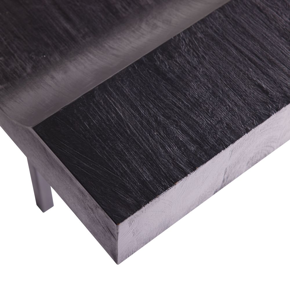 With its sophisticated form, this bench delivers an austere beauty. The cutout-shaped silhouette of the bench seat creates a visually impactful element over a sleek blackened iron base. Black finished teak wood features a heavy wire brushing that adds extra texture and highlights the natural wood grain. Wood will vary.